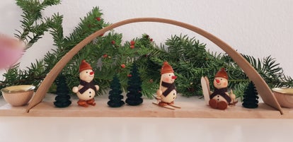 The candle arch is made from different types of wood and has a colored, matt lacquered finish. The width is 40 cm, the height is 15 cm and the depth is 4 cm. The arch is equipped with 3 snowmen and 4 marigold trees.